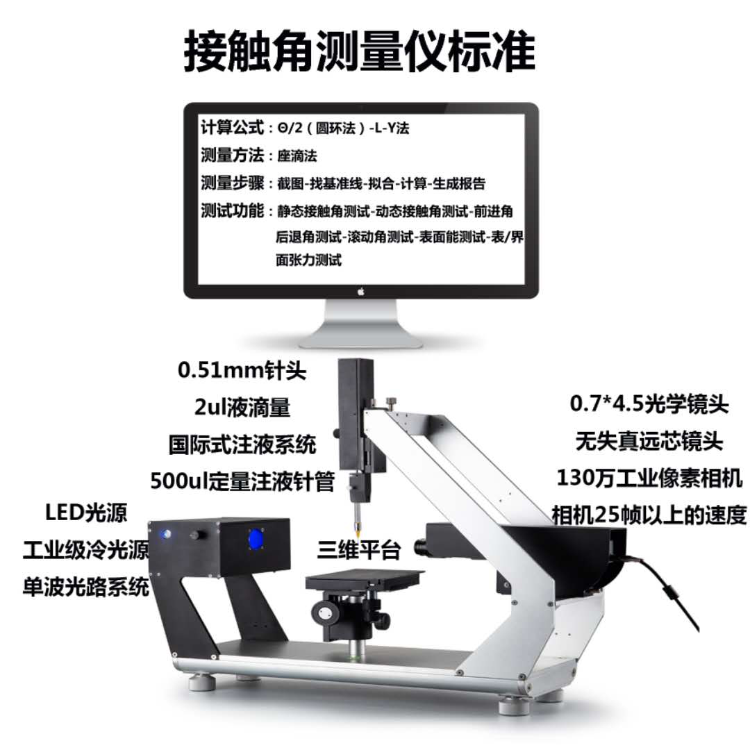 水滴角測試功能:靜態(tài)接觸角測試;動態(tài)接觸角測試;視頻接觸角測試;滾動角測試;前進角后退角測試;表面能測試;表/界面張力測試